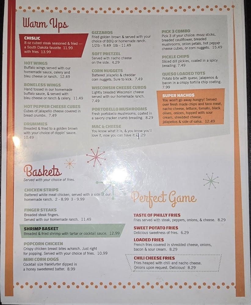 Starters, known as warm-ups, include local favorites like chislic and hot wings. These shareable plates are perfect for snacking while enjoying the bowling game. Desserts, although limited, offer the sweet treat of Funnel Fries to round off your meal.